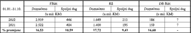 Prihodi od indirektnih poreza u deset mjeseci 2022. godine iznosili su osam milijardi i 213 miliona KM i veći su za milijardu i 310 miliona KM ili 19 posto u odnosu na isti period 2021. godine kada su iznosili šest milijardi i 903 miliona KM.